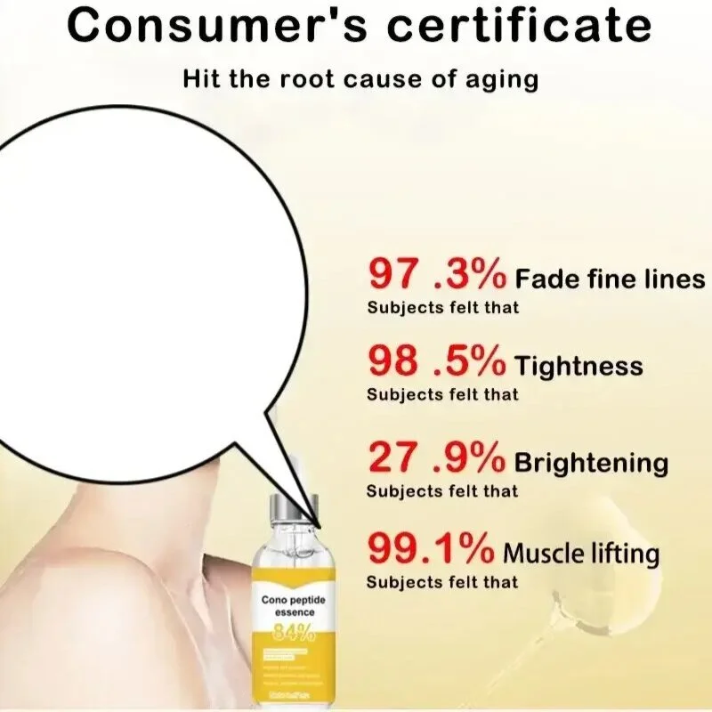 أثبتت الدراسات السريرية أن Cono Peptide يقدم نتائج رائعة في مجال العناية بالبشرة المضادة للشيخوخة. أبلغ مستخدمو هذا المصل الفعال المضاد للشيخوخة لإزالة تجاعيد الوجه عن انخفاض مذهل بنسبة 97.39% في السبب الجذري لتجاعيد الشيخوخة. يسلط هذا الانخفاض الكبير الضوء على قدرة المصل على استهداف و تخفيف المشكلات الأساسية المرتبطة بشيخوخة الجلد.