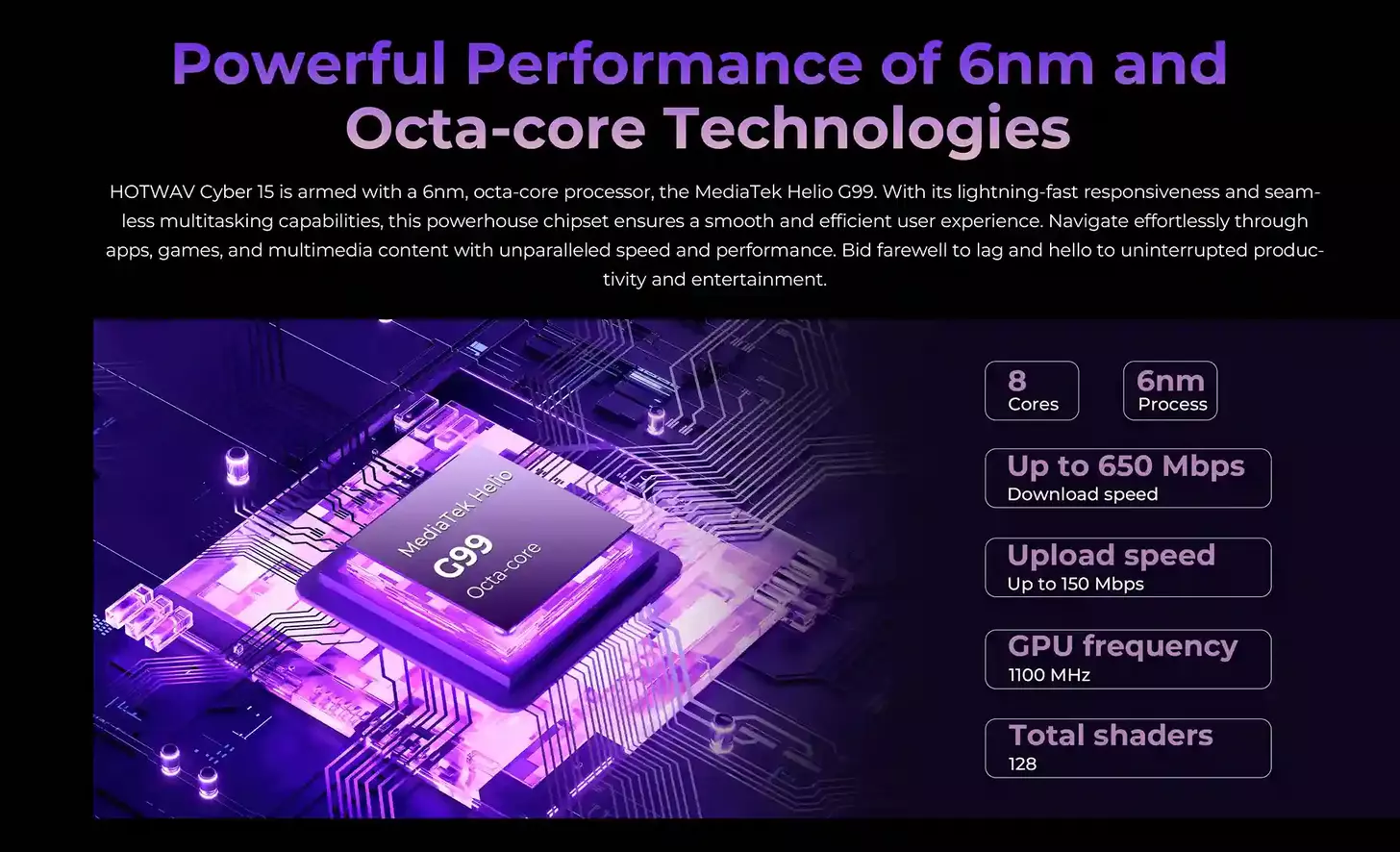يعتمد HOTWAV Cyber 15 على معالج ثماني النواة (2×2.2 GHz Cortex-A76 + 6×2.0 GHz Cortex-A55)، مما يضمن أداءً سلسًا وسريعًا. هذه التقنية تجعل الجهاز مثاليًا لتشغيل الألعاب الثقيلة وتطبيقات المونتاج بسلاسة.