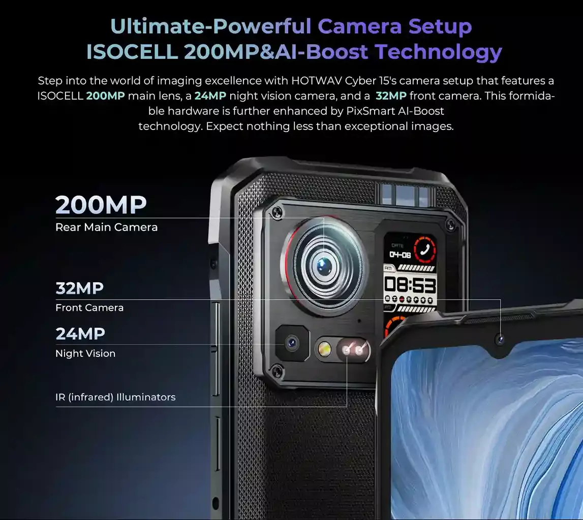 من بين المميزات الأساسية لهاتف HOTWAV Cyber 15 شاشة 6.6 بوصة بدقة 2K، وتصنيف IP68/IP69K الذي يضمن مقاومة الماء و الغبار. كما يتمتع الجهاز ببطارية 6280 مللي أمبير تدوم لفترات طويلة، بالإضافة إلى استخدام تقنيات متقدمة مثل Corning Gorilla Glass 3 لزيادة المتانة.