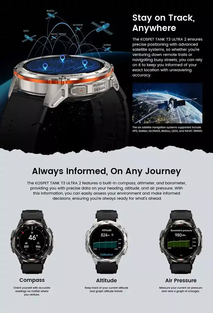 تتميز ساعة KOSPET TANK T3 Ultra 2 ببوصلة رقمية مدمجة ومقياس ارتفاع بارومتري. توفر البوصلة معلومات دقيقة عن الاتجاهات، بينما يقيس مقياس الارتفاع التغيرات في الارتفاع والضغط الجوي.
