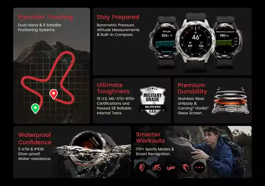 عمر البطارية مع تتبع التمارين باستخدام (GPS Workout Life) : 30-35 ساعة هذه نقطة قوة حاسمة للمغامرين والرياضيين. القدرة على تتبع أنشطة GPS المستمرة لمدة تصل إلى 35 ساعة تعني أن الساعة يمكنها تغطية رحلات المشي الطويلة، ركوب الدراجات، أو الجري لمسافات طويلة دون الحاجة لإعادة الشحن.