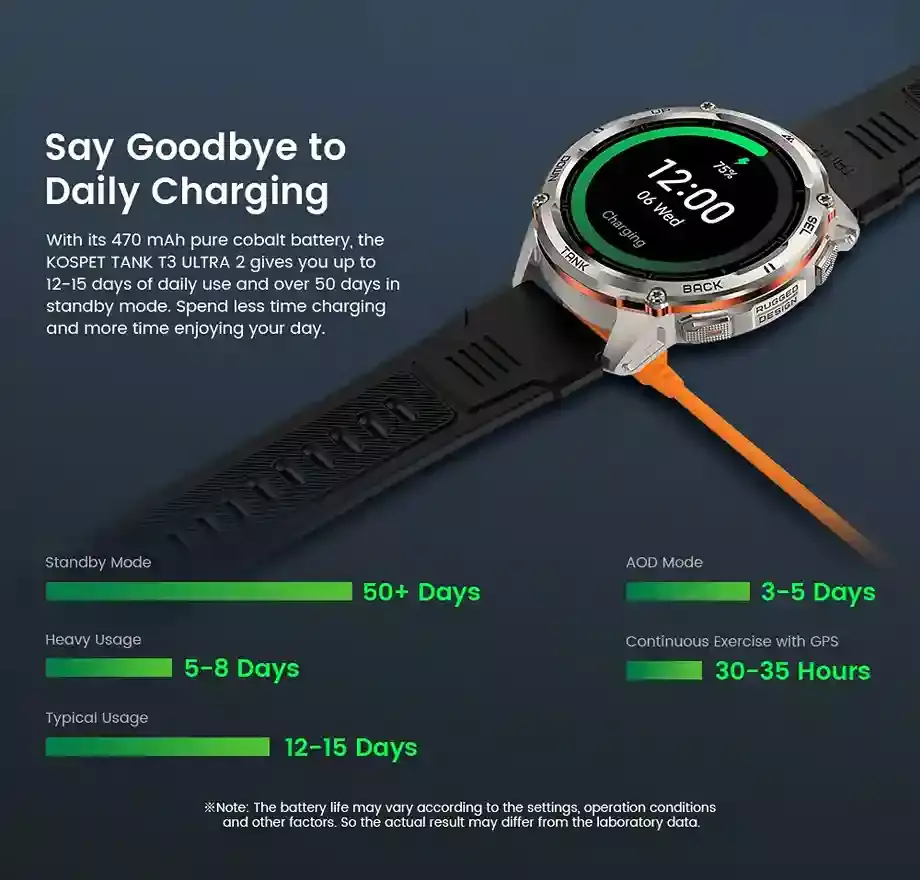 تتميز ساعة KOSPET T3 Ultra 2 بعمر بطارية استثنائي يمكن أن يدوم لأيام عديدة، وذلك حسب أوضاع توفير الطاقة المختلفة.