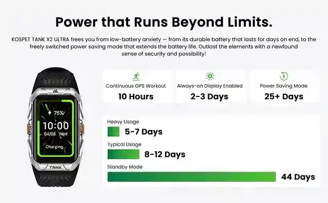 تتميز ساعة KOSPET TANK X2 Ultra بعمر بطارية استثنائي يلبي احتياجات المستخدمين الذين يبحثون عن أداء طويل الأمد. توفر الساعة أداءً ممتازًا في مختلف أوضاع الاستخدام، مما يجعلها الخيار الأمثل للمغامرين والرياضيين.