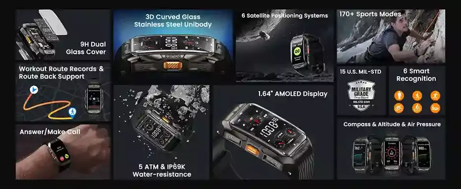 تتميز الساعة بتصميم من الفولاذ المقاوم للصدأ وشاشة AMOLED مذهلة، مع مقاومة للماء و شهادات عسكرية متعددة. توفر أكثر من 170 وضعًا رياضيًا مع نظام تحديد مواقع مزدوج و مراقبة صحية شاملة و عمر بطارية استثنائي.