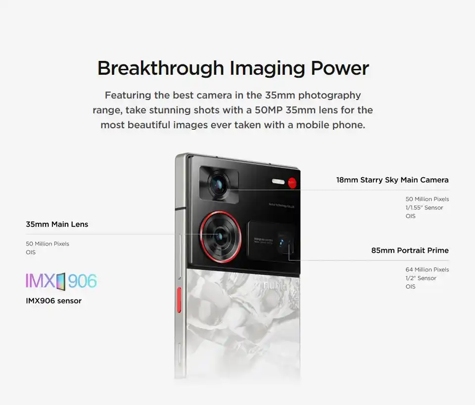 يتميز Nubia Z60 Ultra بنظام كاميرا ثلاثية متقدمة، حيث تأتي العدسة الرئيسية بدقة 50 ميجابكسل، مما يوفر صورًا واضحة وغنية بالتفاصيل. هذا النظام يسمح بالتقاط صور بجودة عالية في مختلف ظروف الإضاءة.