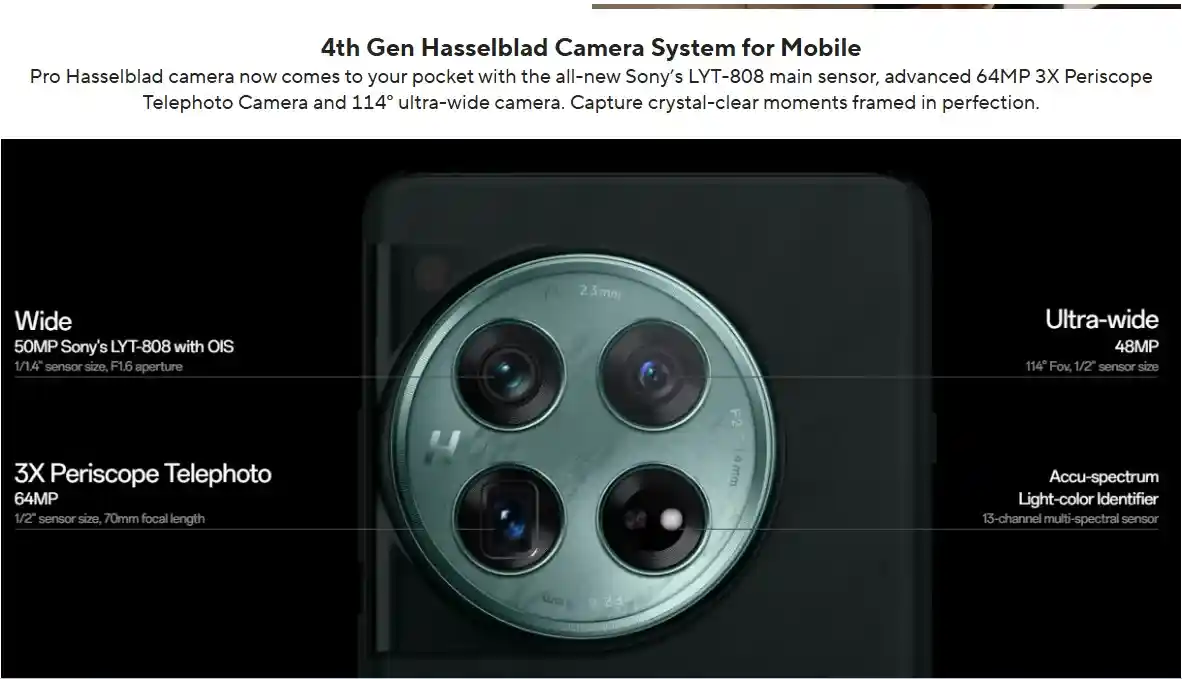 يتميز هاتف OnePlus 12 بنظام كاميرا متطور مطور بالتعاون مع Hasselblad، مما يوفر تجربة تصوير احترافية.