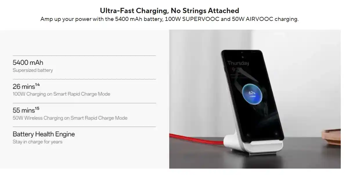 - شحن سلكي فائق السرعة: تقنية 100W SUPERVOOC تشحن البطارية بالكامل في وقت قصير جدًا.