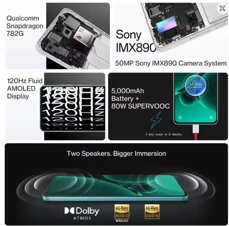 يتميز هذا الهاتف بمعالج Qualcomm Snapdragon 782G الذي يوفر أداءً استثنائيًا مع كفاءة عالية في استهلاك الطاقة، بالإضافة إلى بطارية ضخمة بسعة 5000 مللي أمبير التي تدعم تقنية الشحن فائق السرعة 80W SUPERVOOC.