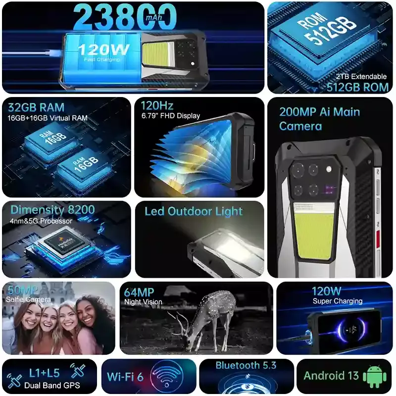 يجمع الهاتف بين القوة الداخلية والميزات الخارجية المبتكرة. فهو يعمل بمعالج MediaTek Dimensity 8200 وذاكرة RAM 32 جيجابايت، مما يضمن أداءً سلسًا للتطبيقات والألعاب. من ناحية التصوير، يمتلك الهاتف كاميرا رئيسية بدقة 200 ميجابكسل، بالإضافة إلى كاميرا للرؤية الليلية بدقة 64 ميجابكسل تعمل بالأشعة تحت الحمراء، مما يسمح بالتقاط صور واضحة في الظلام الدامس. كما يتميز بشاشة بمعدل تحديث 120 هرتز، مما يوفر تجربة بصرية سلسة ومريحة.