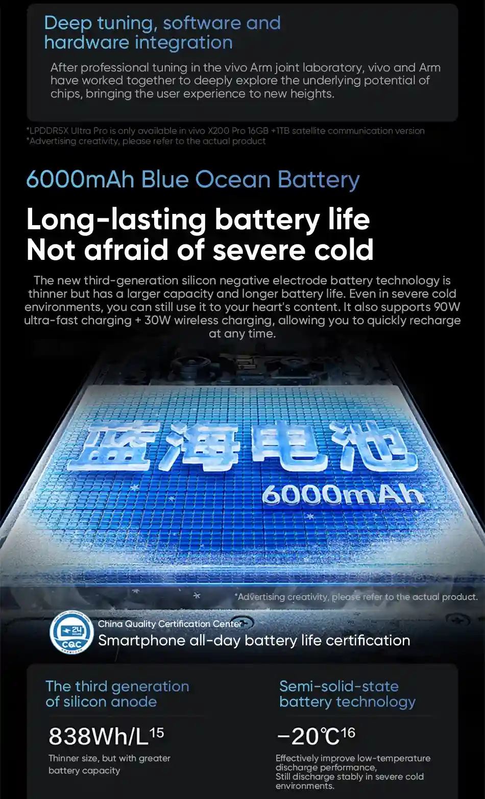 بطارية VIVO X200 PRO بسعة 6000 مللي أمبير هي واحدة من أكبر البطاريات المستخدمة في الهواتف الرائدة حاليًا. طورت Vivo تقنية جديدة للبطارية تتيح زيادة السعة مع تقليل الحجم الفيزيائي، مما يسمح بتضمين بطارية كبيرة دون زيادة سماكة الجهاز بشكل كبير.