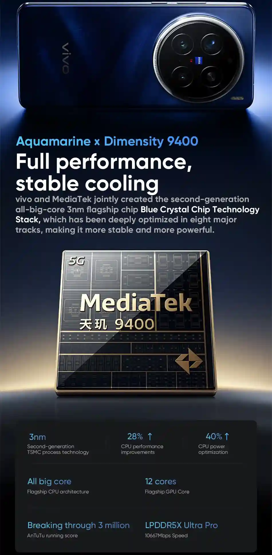 يعتبر VIVO X200 PRO أول هاتف يأتي بمعالج MediaTek Dimensity 9400 الرائد والمصنع بتقنية 3 نانومتر، مما يمنحه أداءً استثنائياً وكفاءة عالية في استهلاك الطاقة. كما يتميز بشاشة AMOLED مقاس 6.78 بوصة بتقنية LTPO وبدقة 2800 × 1260 بكسل، وسطوع يصل إلى 4500 شمعة، مما يوفر تجربة مشاهدة مذهلة.