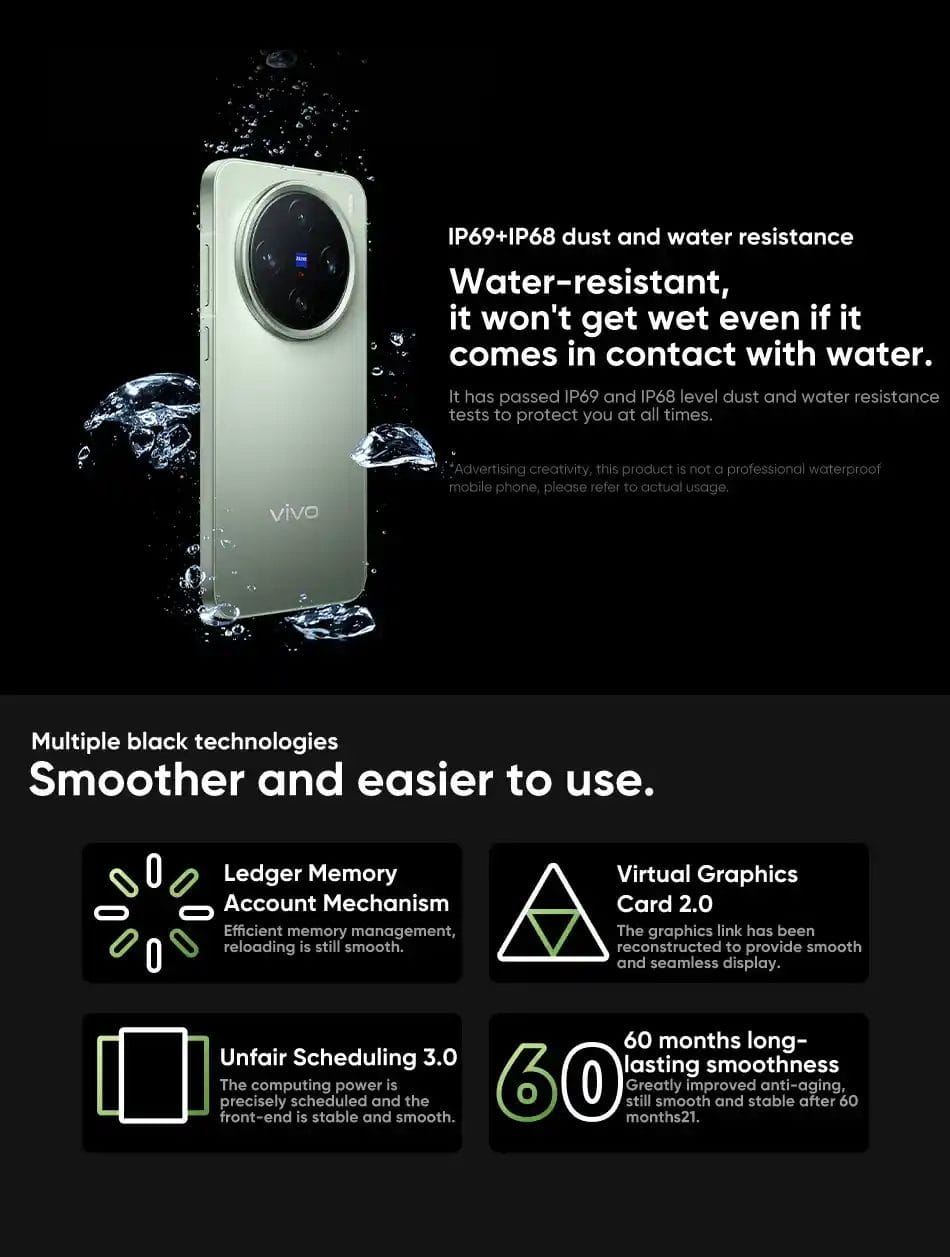 يأتي الهاتف بنظام كاميرا ثلاثي متطور من Zeiss، حيث توفر الكاميرا الرئيسية بدقة 50 ميجابكسل تجربة تصوير احترافية. كما يعمل الهاتف بنظام Android15 مع واجهة OriginOS5 المحسنة، مما يوفر تجربة استخدام سلسة ومتطورة.