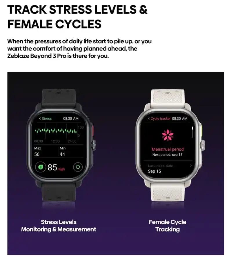 على صعيد المراقبة الصحية، توفر Zeblaze Beyond 3 Pro حماية شاملة على مدار الساعة. فهي تراقب معدل ضربات القلب باستمرار (مع تنبيهات للحالات غير الطبيعية)، وتقيس مستوى الأكسجين في الدم (SpO2)، و تتبع مستويات التوتر، و تقدم تحليلاً مفصلاً لجودة النوم ومراحله. كما تتضمن ميزات خاصة بالمرأة لتتبع الدورة الشهرية و تمارين التنفس لتعزيز الاسترخاء.