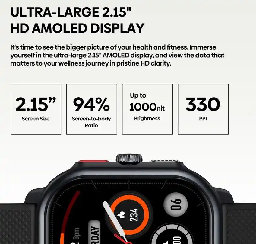 تأتي ساعة Zeblaze Beyond3 Pro بشاشة AMOLED بحجم 2.15 بوصة، مما يوفر دقة عالية ووضوحًا في عرض المعلومات. هذه الشاشة تجعل من السهل قراءة البيانات حتى في ظروف الإضاءة الصعبة.