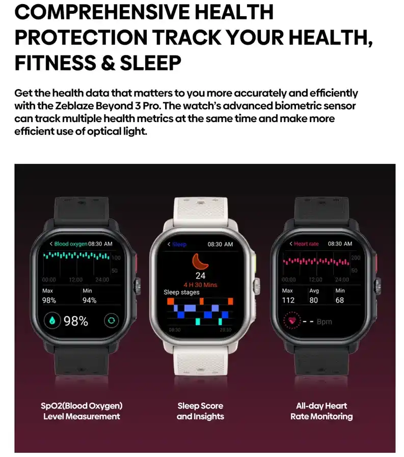على صعيد المراقبة الصحية، توفر Zeblaze Beyond 3 Pro حماية شاملة على مدار الساعة. فهي تراقب معدل ضربات القلب باستمرار (مع تنبيهات للحالات غير الطبيعية)، وتقيس مستوى الأكسجين في الدم (SpO2)، و تتبع مستويات التوتر، و تقدم تحليلاً مفصلاً لجودة النوم ومراحله. كما تتضمن ميزات خاصة بالمرأة لتتبع الدورة الشهرية و تمارين التنفس لتعزيز الاسترخاء.